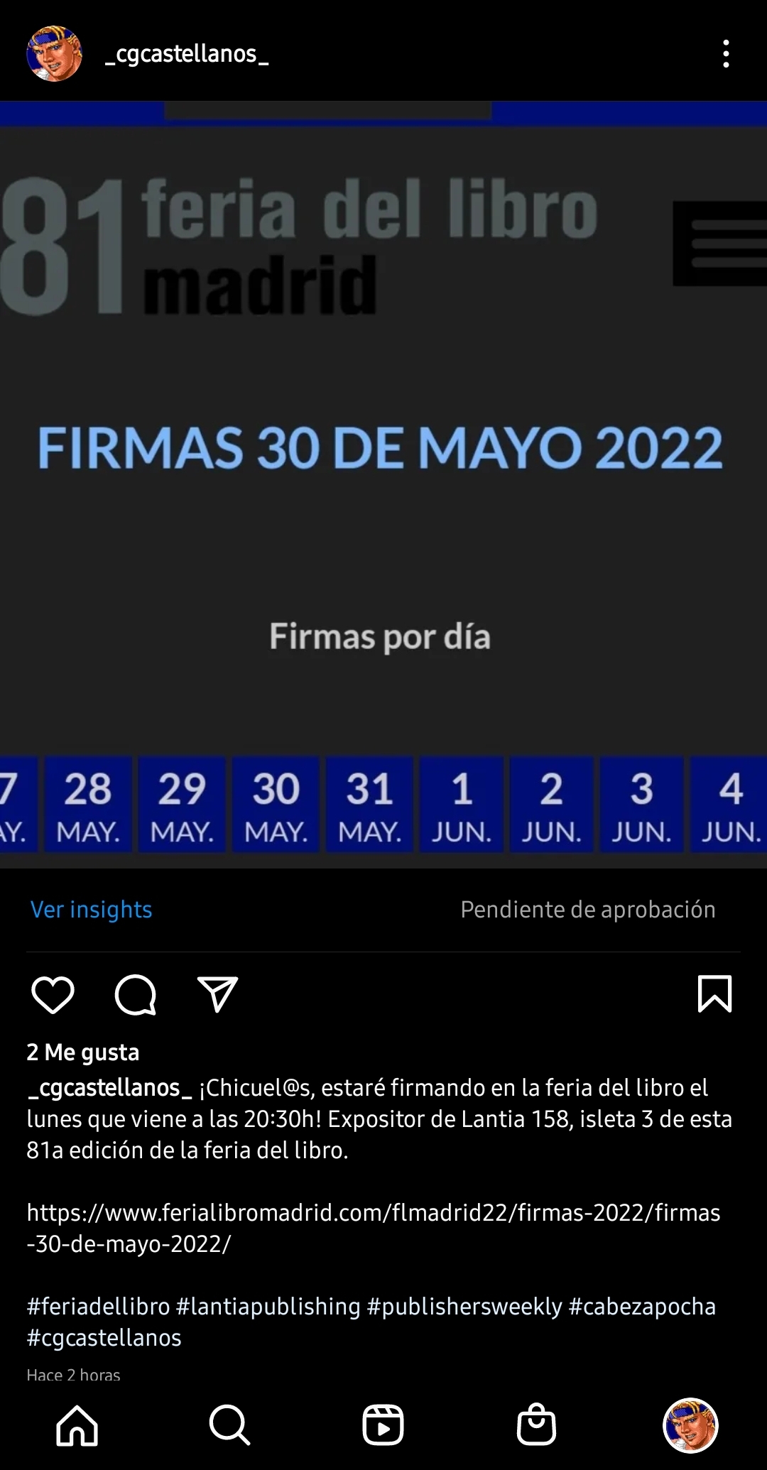 Firmo a Cabezapocha si me deja —que tiene muy mala uva— en el stand de Lantia el lunes 30 de mayo a las 20:30h. Expositor de Lantia 158, isleta 3.